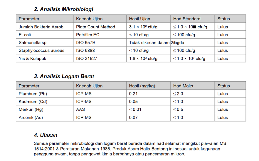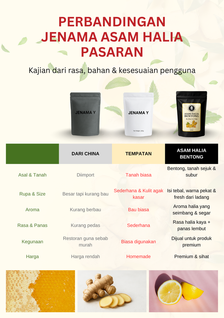 Setiap batch Asam Halia Bentong diuji di makmal untuk pastikan ia bersih, selamat dan ikut piawaian. Tiada pengawet, tiada pewarna tiruan, hanya bahan semula jadi yang disahkan selamat. Kami percaya, kejujuran bermula dari apa yang masuk ke dalam badan.